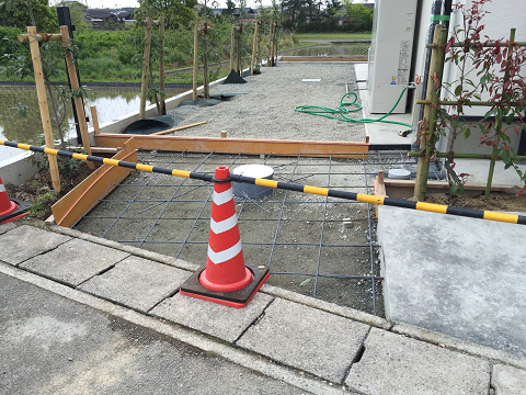 玄関ポーチの敷きレンガ周りの土間コン打設状況。