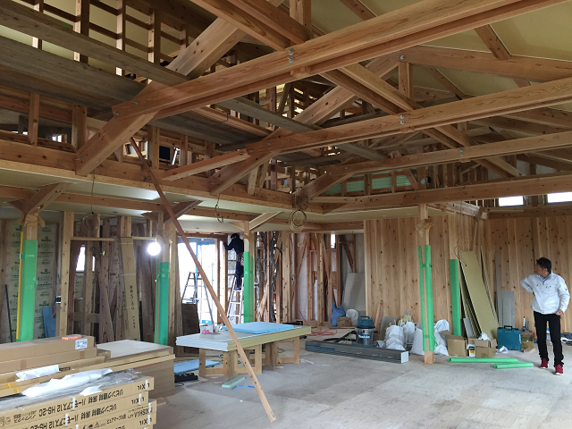 大屋根の登り梁が取り付けられ横方向に母屋が設置されている。